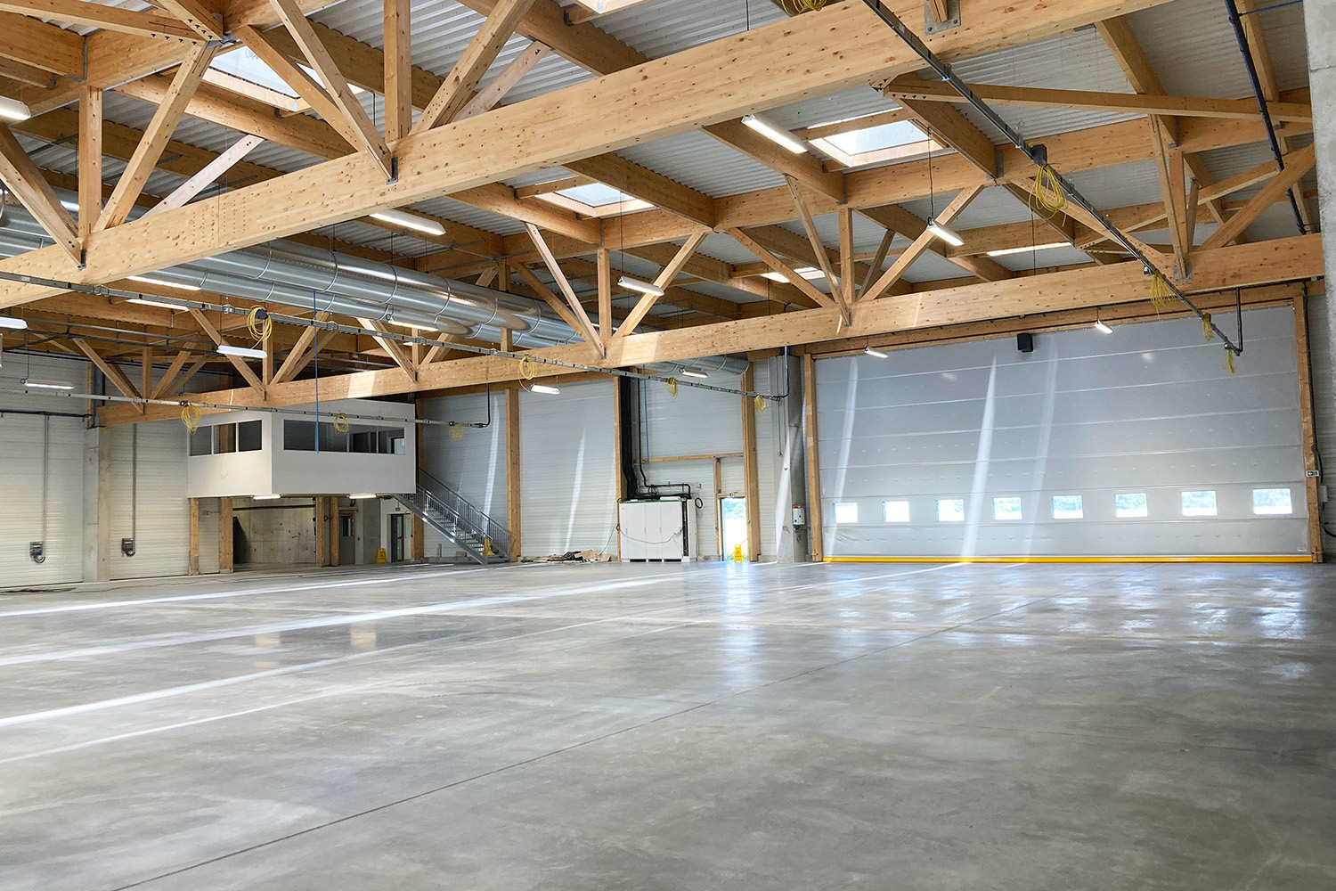 Le projet mixe les matériaux : les bureaux sont composés de murs en béton et plancher et toiture en bois tandis que la halle est constituée de poteaux en béton et poutres treillis en bois.